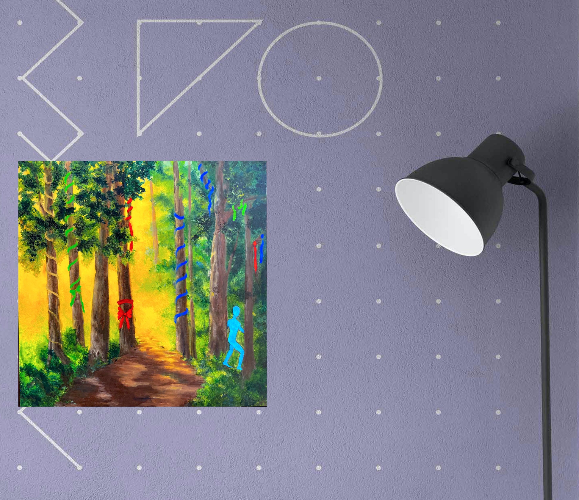Expertly painted in oil on canvas, the Blue Guy in the Woods fine art painting captures the ethereal beauty of ribbons and sunlight peeking through the trees inviting you to explore the mystical path ahead. Let the spirit of the woods guide your imagination on a journey through this magical artwork.