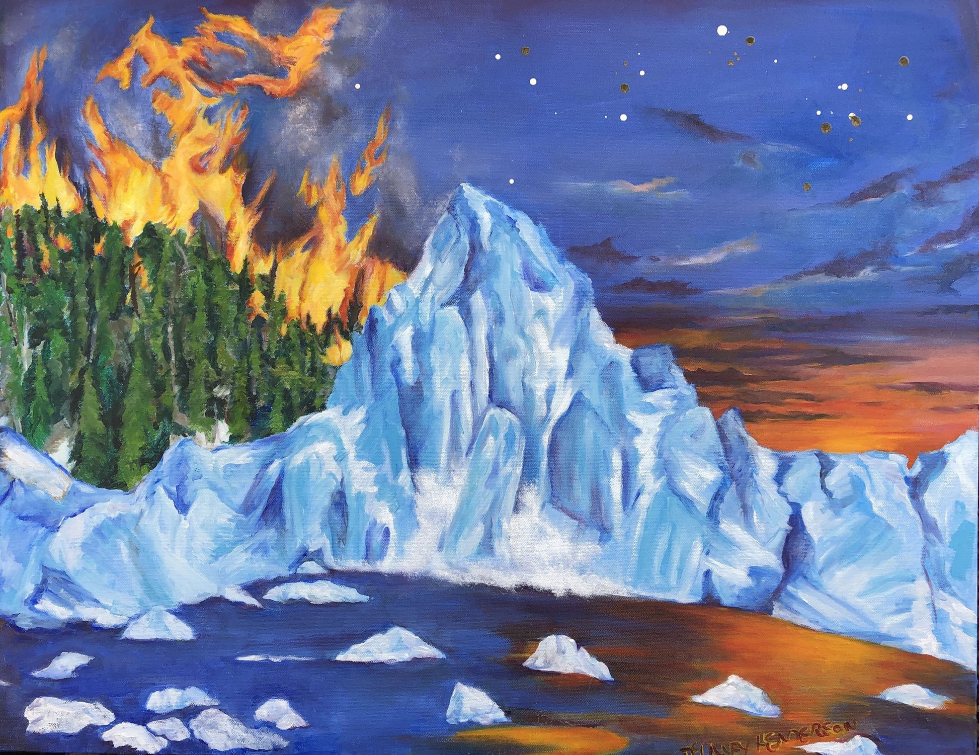 Expertly crafted oil painting depicting disastrous effects of climate change on our planet. Measuring 24” x 30”, this fine art piece captures the melting glaciers and wildfires. raising awareness on the urgent need for ecological preservation while simultaneously illustrating the beauty of our planet. Add a thought-provoking and impactful piece to your art collection.